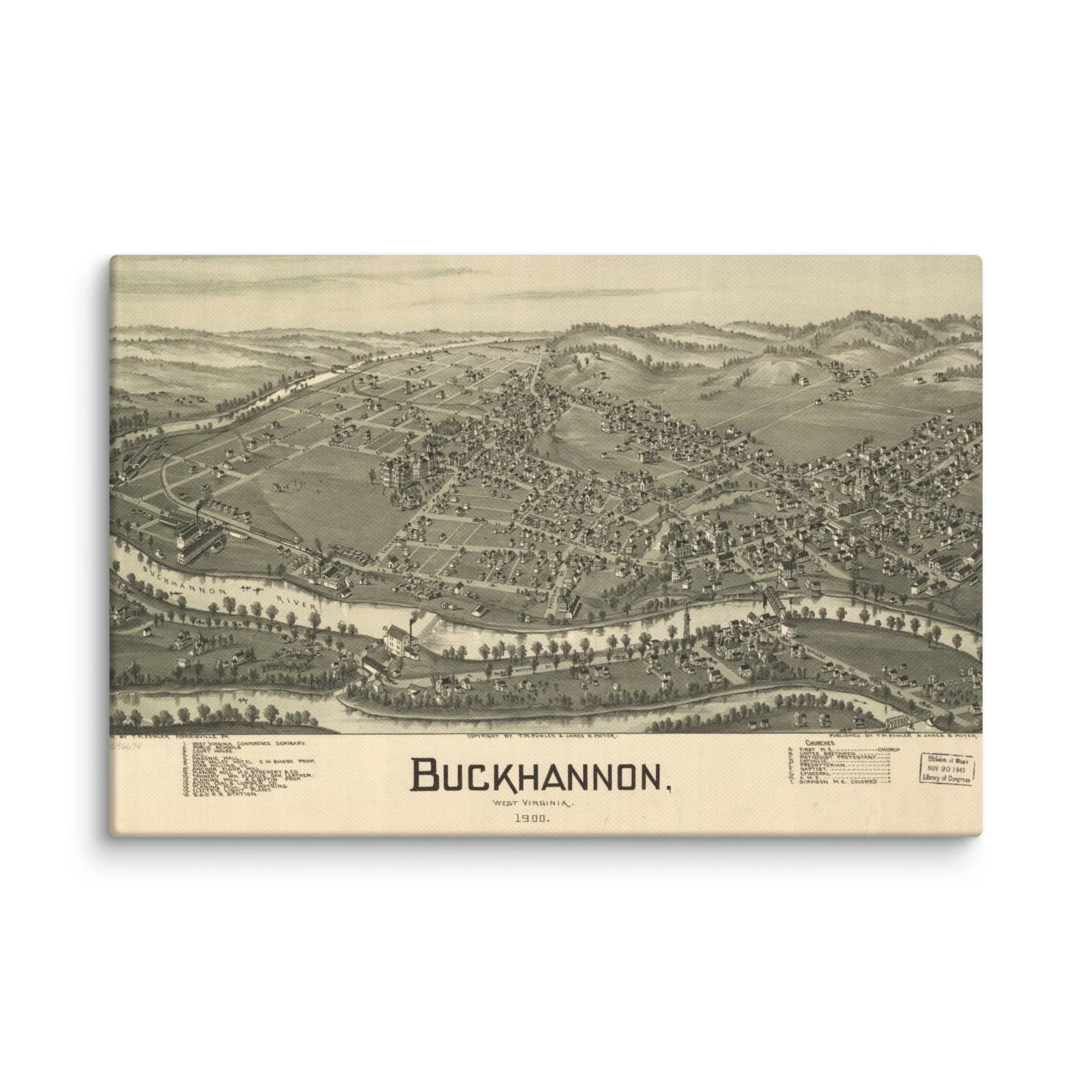 Canvas print 8x12 of Historic Buckhannon, WV Birdseye view map illustrated in the year 1900.